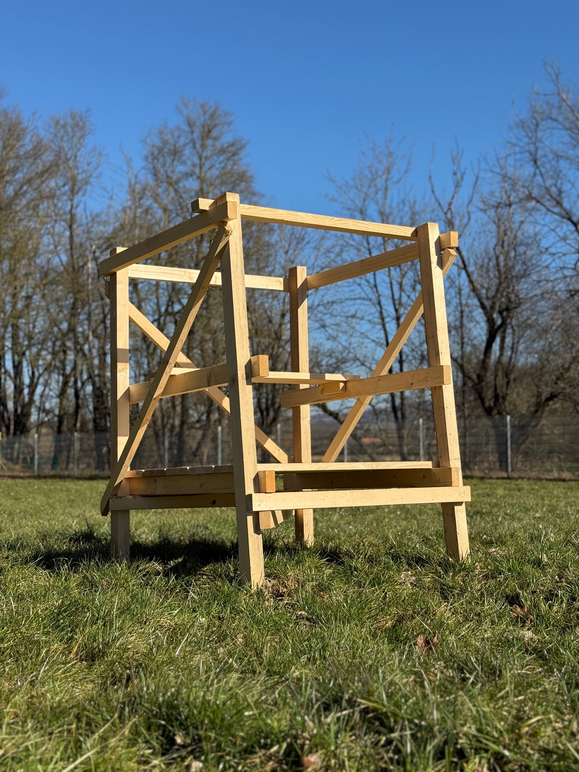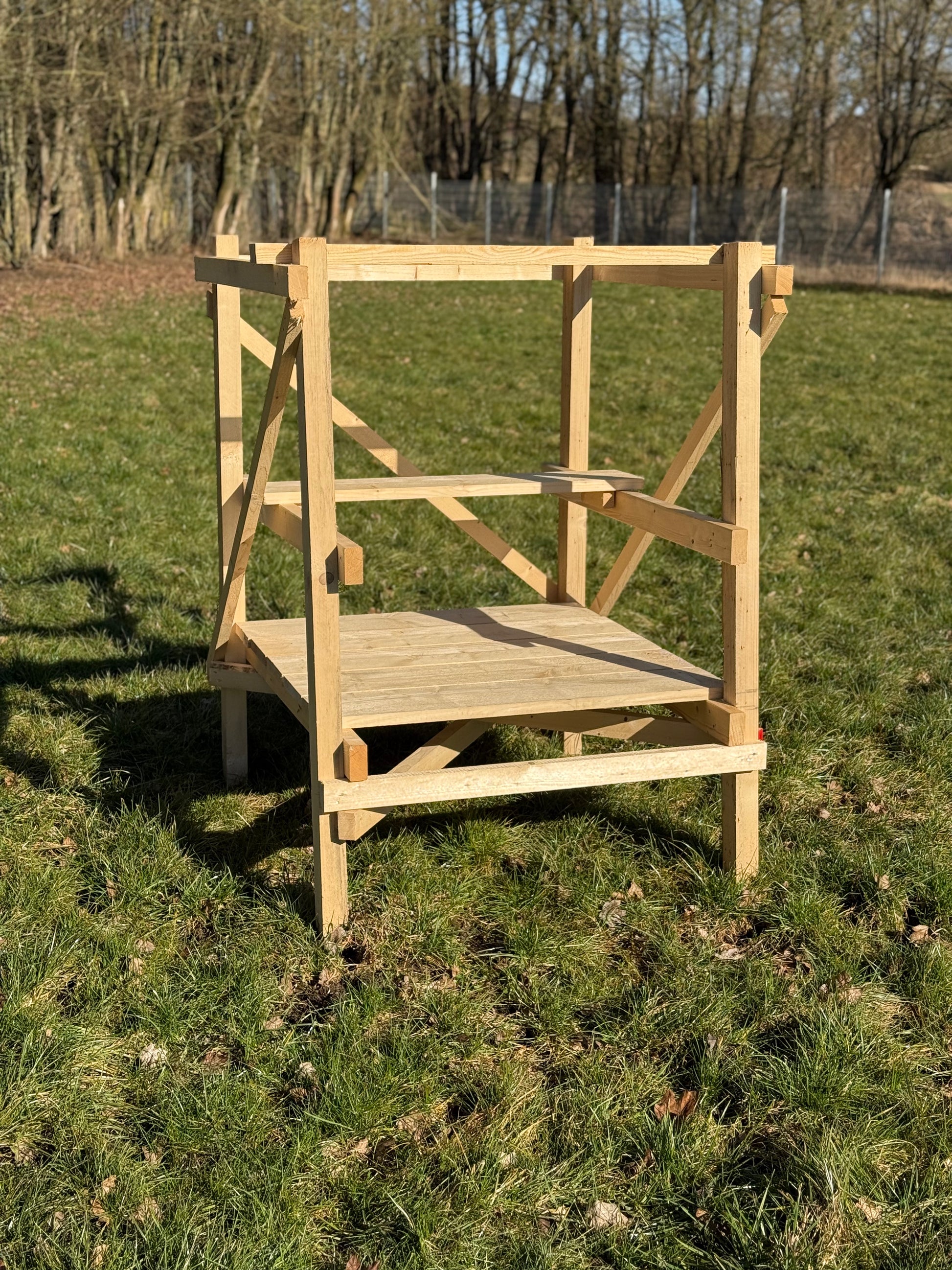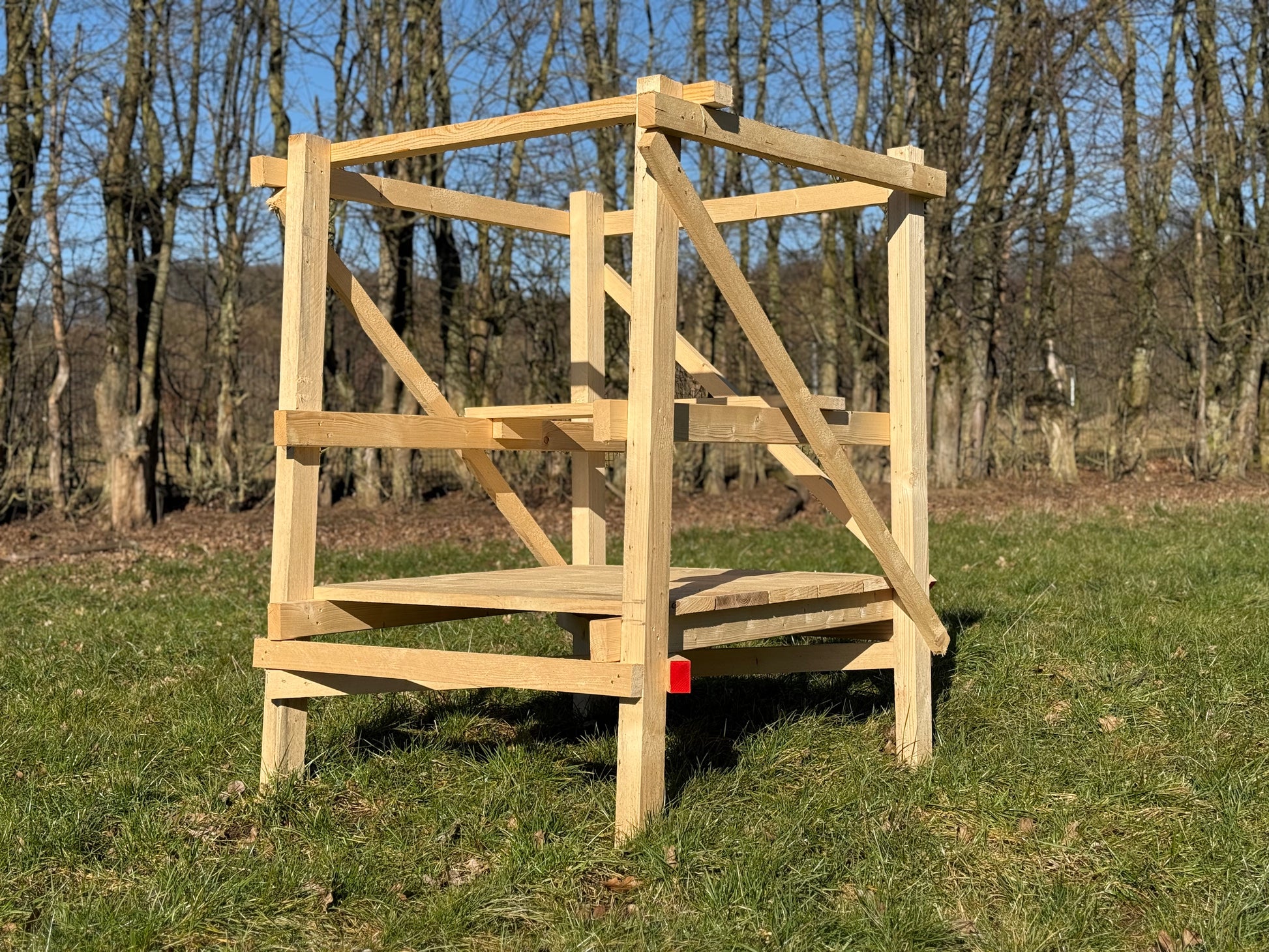 Drückjagdbock nach bewährtem Standardmaß, bodennah, aus Fichte.