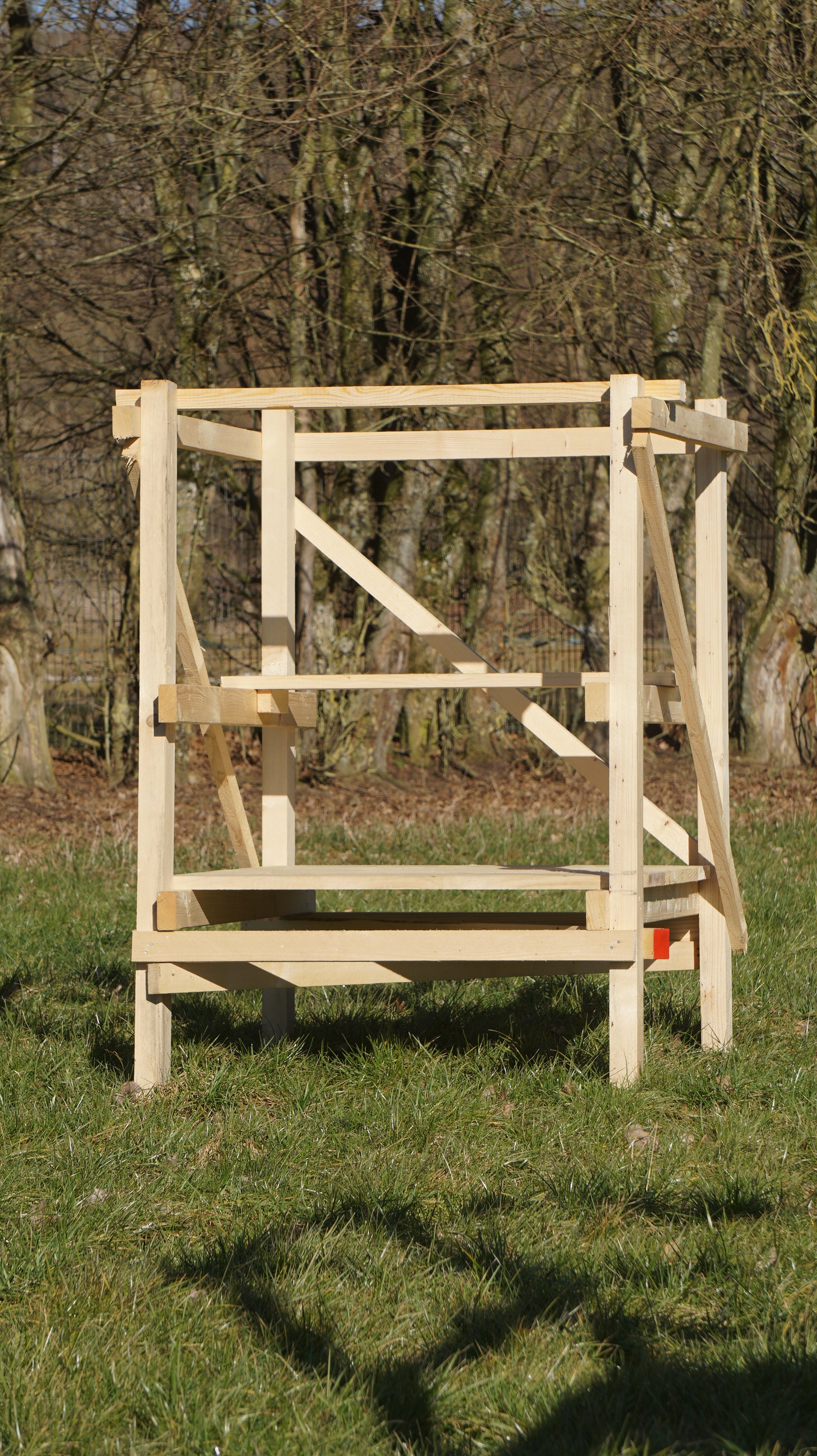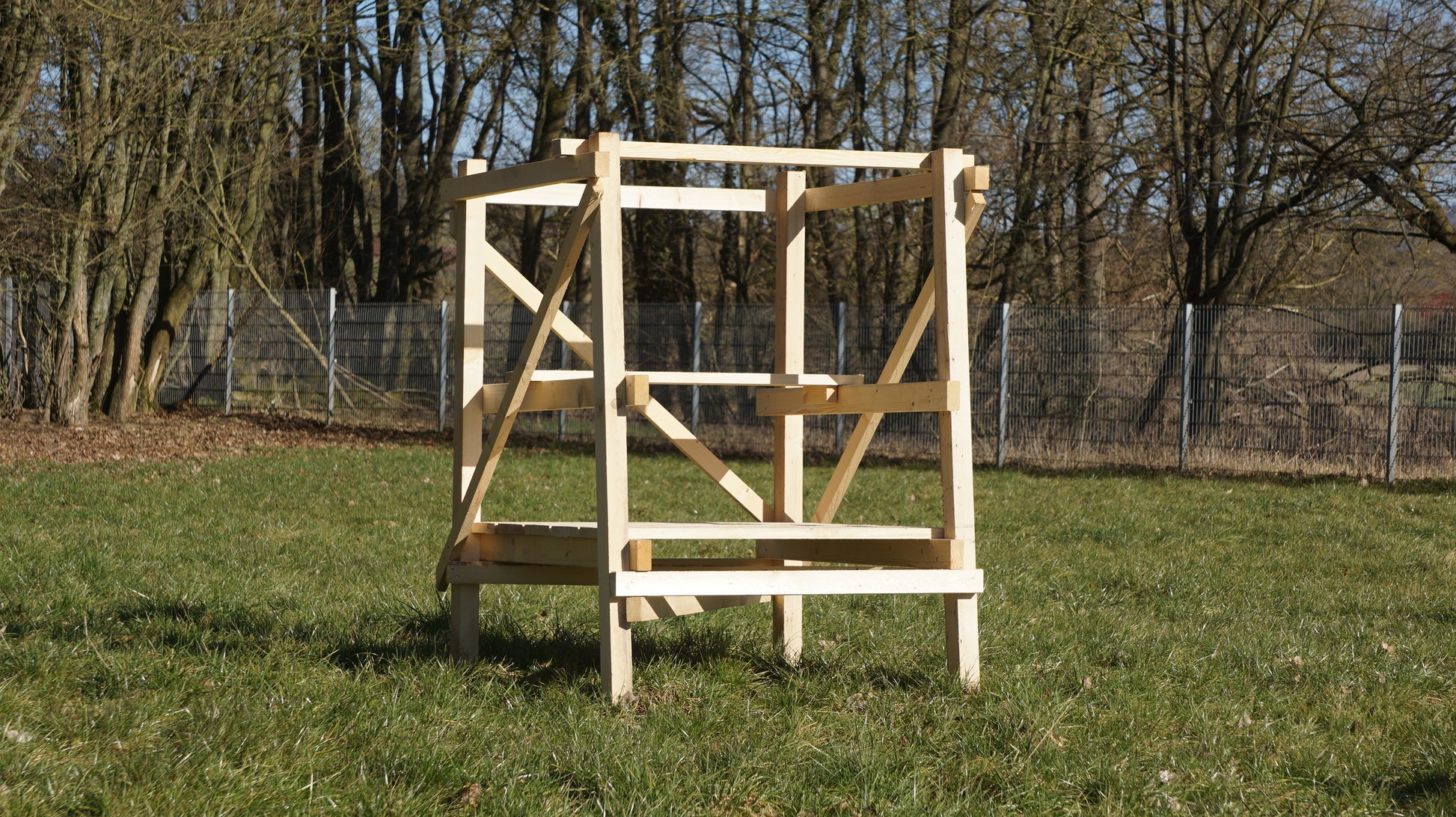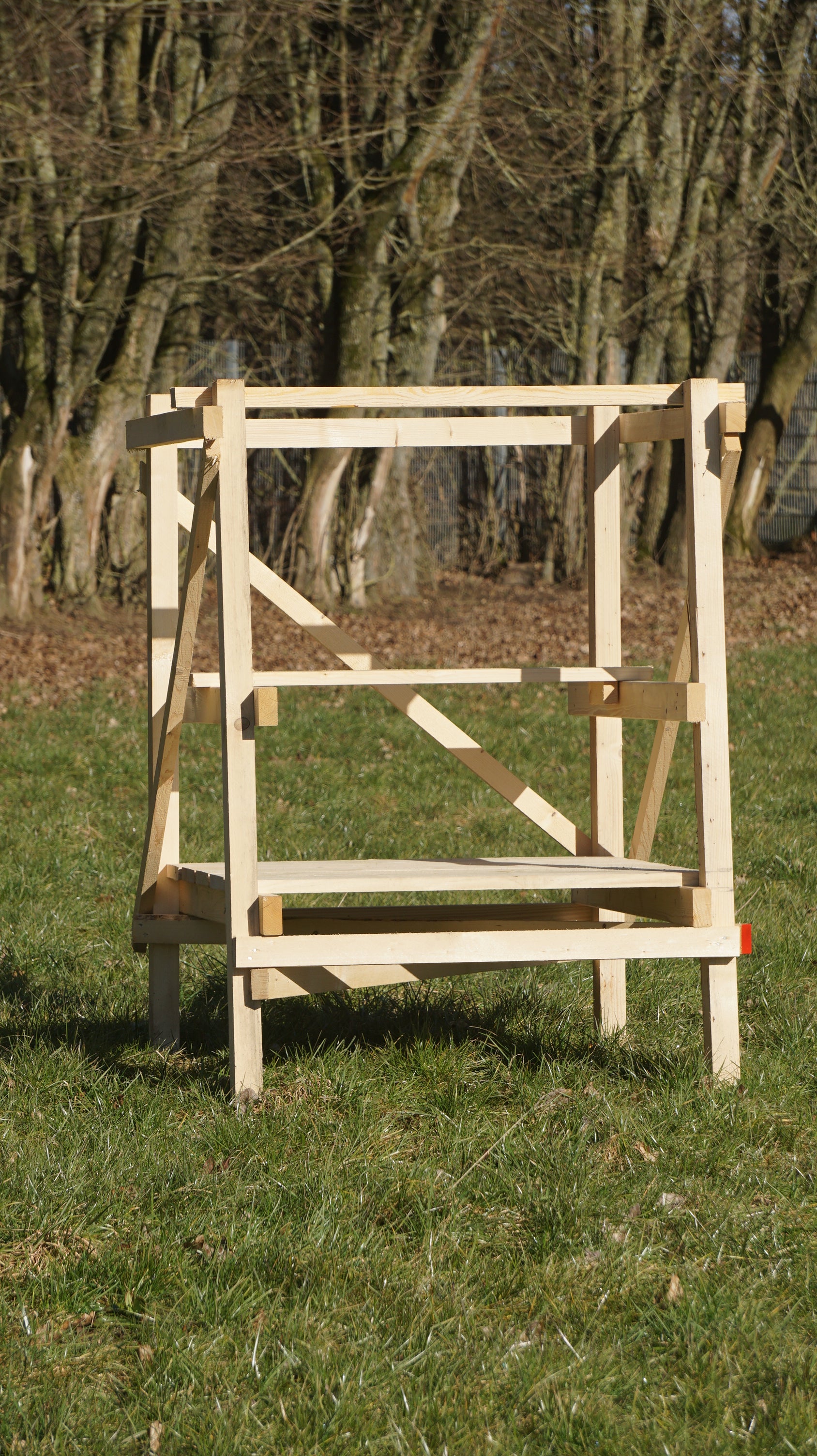 Drückjagdbock nach bewährtem Standardmaß, bodennah, aus Fichte.