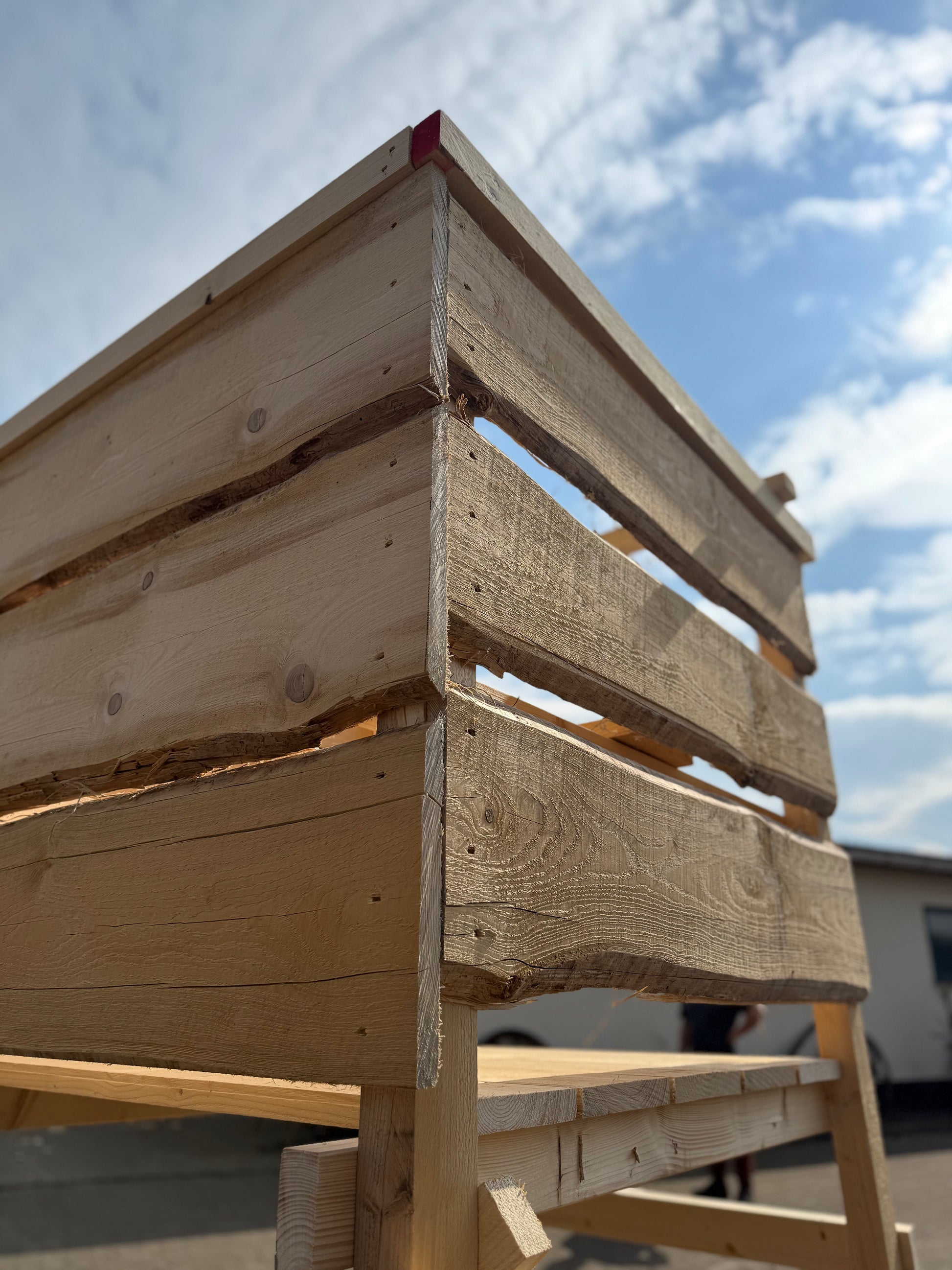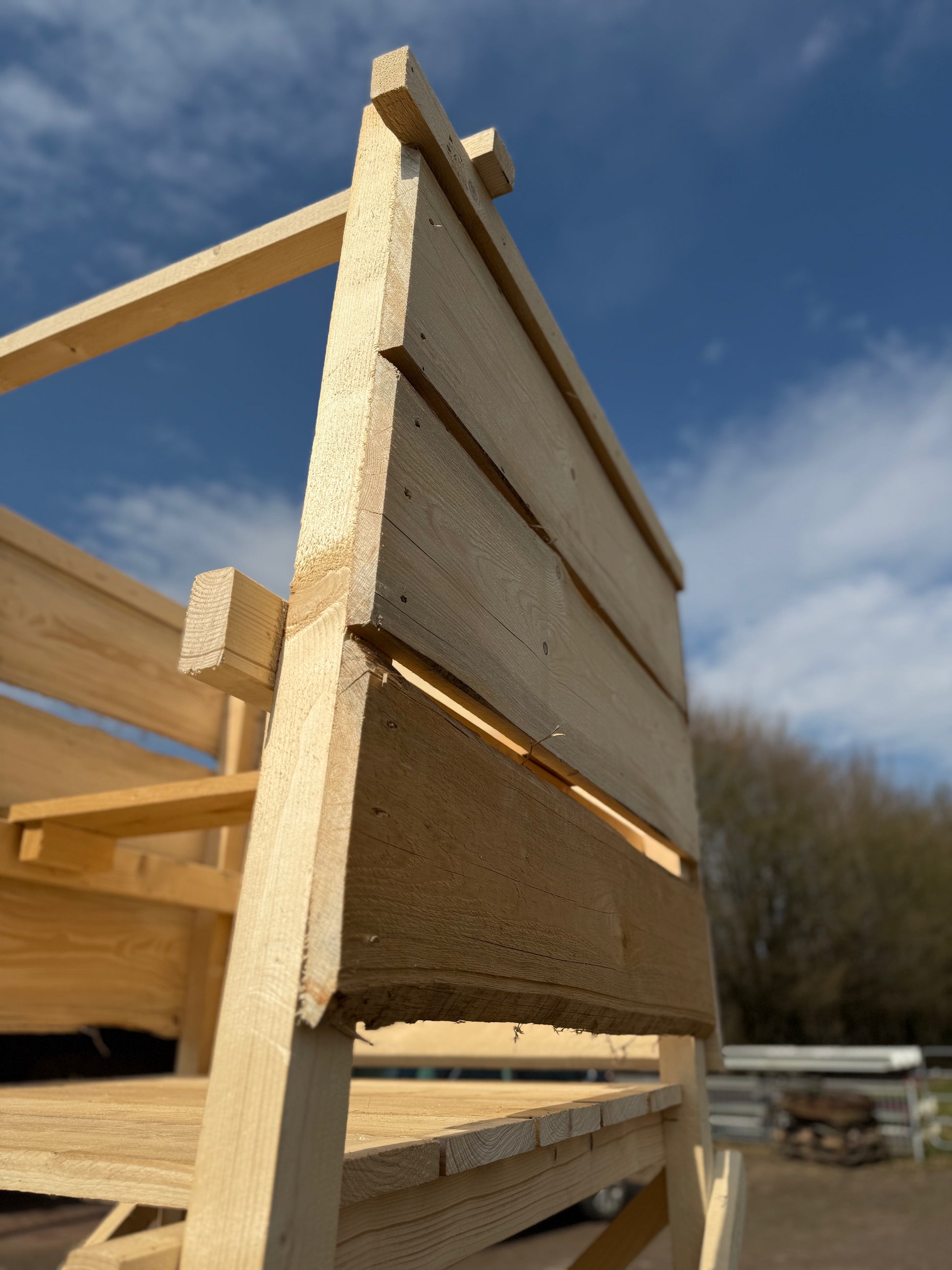 Drückjagdbock nach bewährtem Standardmaß mit Verkleidung, aus Fichte.